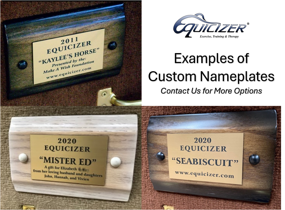 If you are interested in ordering our Elite model Equicizer, <Click Here> to see all menu items and options that can be selected to build your custom Elite Equicizer. Choose what you would like on your personalized engraved nameplate, upload or send us photos of your favorite horse!